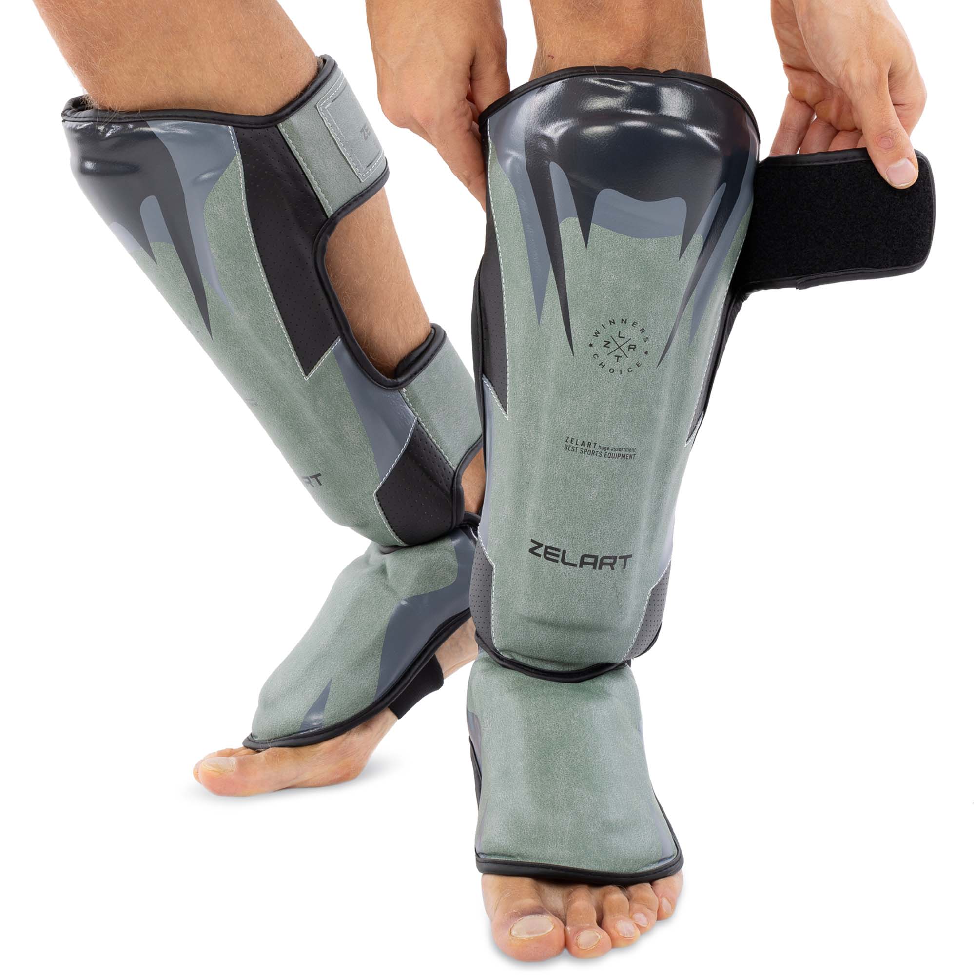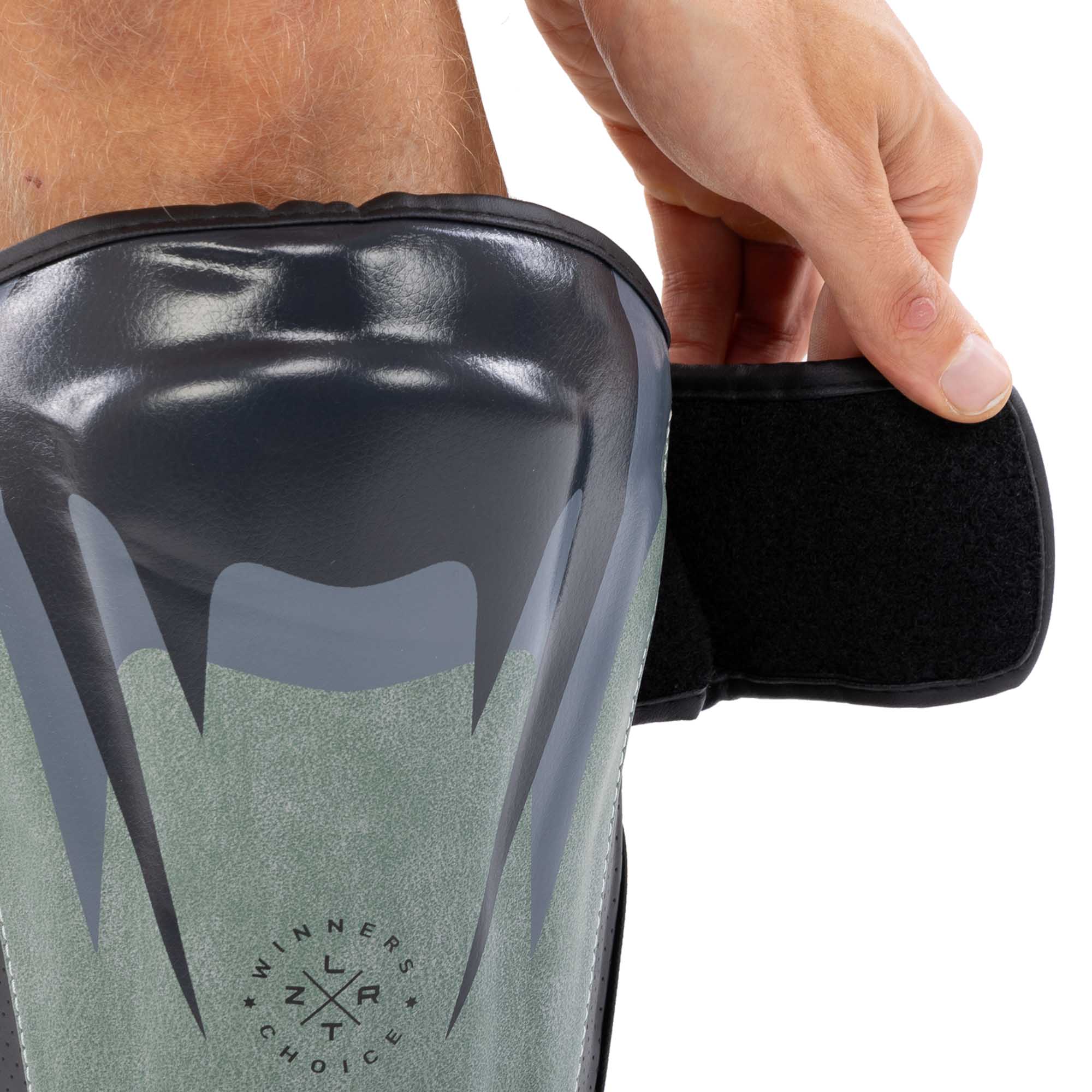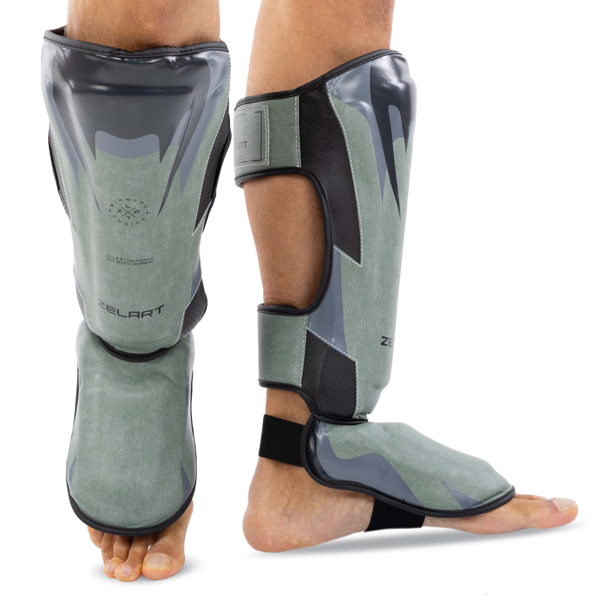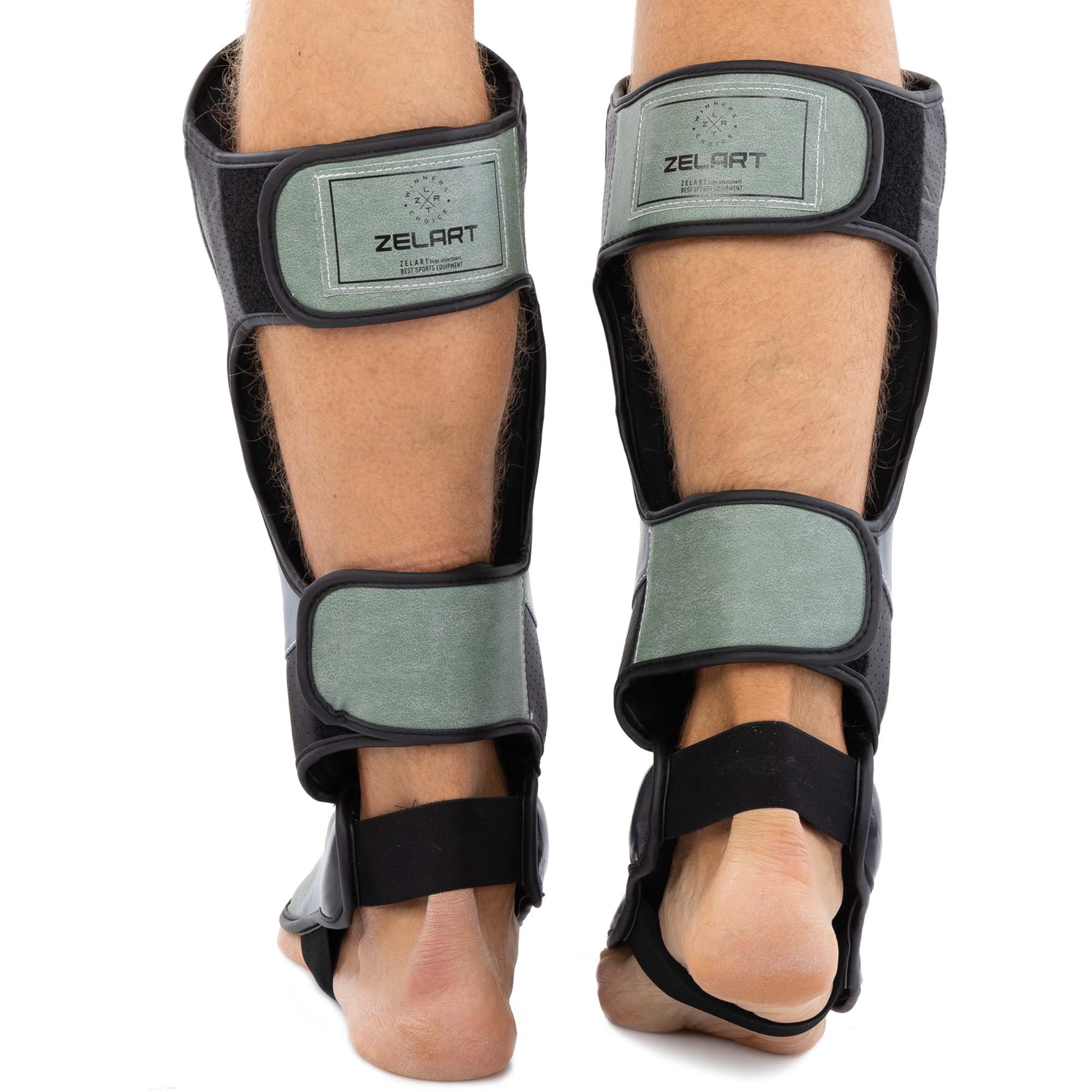 Protecția este fabricată dintr-un material durabil – piele sintetică. Pe partea interioară există o căptușeală moale care amortizează loviturile. Accesoriul este fixat pe picior cu ajutorul curelelor cu velcro.